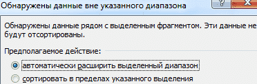 Чтобы сохранить соответствие значений в строках, выберите действие «автоматически расширять выбранный диапазон». В противном случае будет отсортирован только выбранный столбец: структура таблицы будет нарушена.