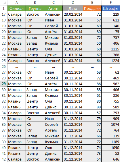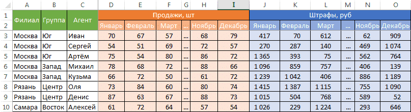 Казалось бы, перед нами безобидный формат сбора информации о продажах агентов и их штрафах. Такое расположение стола визуально хорошо воспринимается человеком, так как оно компактное. Однако, поверьте, это настоящий кошмар - пытаться извлечь данные из таких таблиц и получить промежуточные итоги (агрегированную информацию).