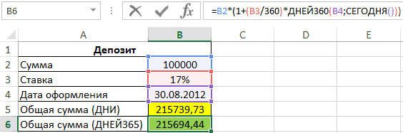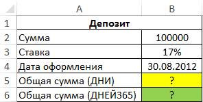Пример 2. В банке внесен депозит на сумму 100 000 руб. Условия договора: ставка - 17%, дата регистрации - 31.08.2012, начисление сложных процентов - ежедневно. Определяет, сколько накоплено за текущий период. Найдите требуемые значения отдельно с помощью функций ДНИ и ДНИ360. Есть ли различия в полученных значениях?