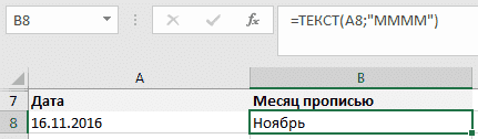 Как и в примере выше, мы будем использовать функцию ТЕКСТ. Формат «MMMM» даст нам полную запись месяца (в именительном падеже):