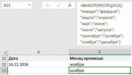 = ВЫБОР (МЕСЯЦ (A1); «Январь»; «Фев»; «Март»; «Апр»; «Май»; «Июнь»; «Июль»; «Август»; «Сентябрь»; «Октябрь»; «Ноябрь» ";"Декабрь”)