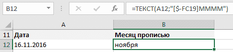 Опять же, нам поможет формат [$ -FC19] MMMM, который записывает месяц на дату в родительном падеже, отличие от предыдущей версии записи только в том, что мы удалили день и год из записи: