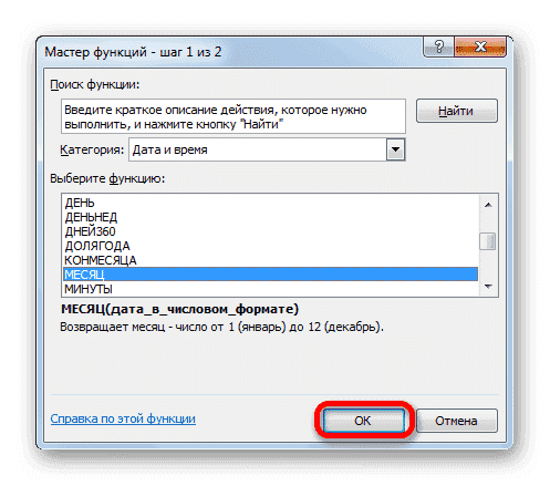 - Откроется окно аргументов функции МЕСЯЦ. Его задачи аналогичны предыдущему оператору, только отображает значение номера месяца. В единственном поле этого окна установите такую же ссылку на исходный номер. Затем в строке формул щелкните название «ДЕНЬ».