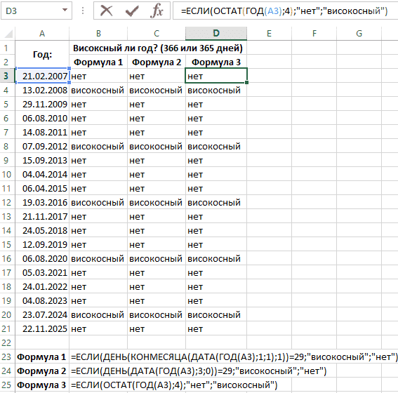 При работе с датами особая сложность заключается в том, что один раз в 4 года количество дней в году составляет 366, а в обычных годах - 365. Поэтому иногда необходимо использовать предыдущие примеры и формулы для различных расчетов в Excel.