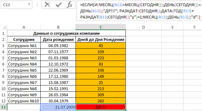 Чтобы просмотреть запись о сегодняшнем дне рождения сотрудника, используйте следующую формулу:
