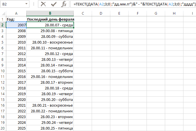 На следующем рисунке показано, как рассчитать день недели и дату последнего дня февраля для любого года: