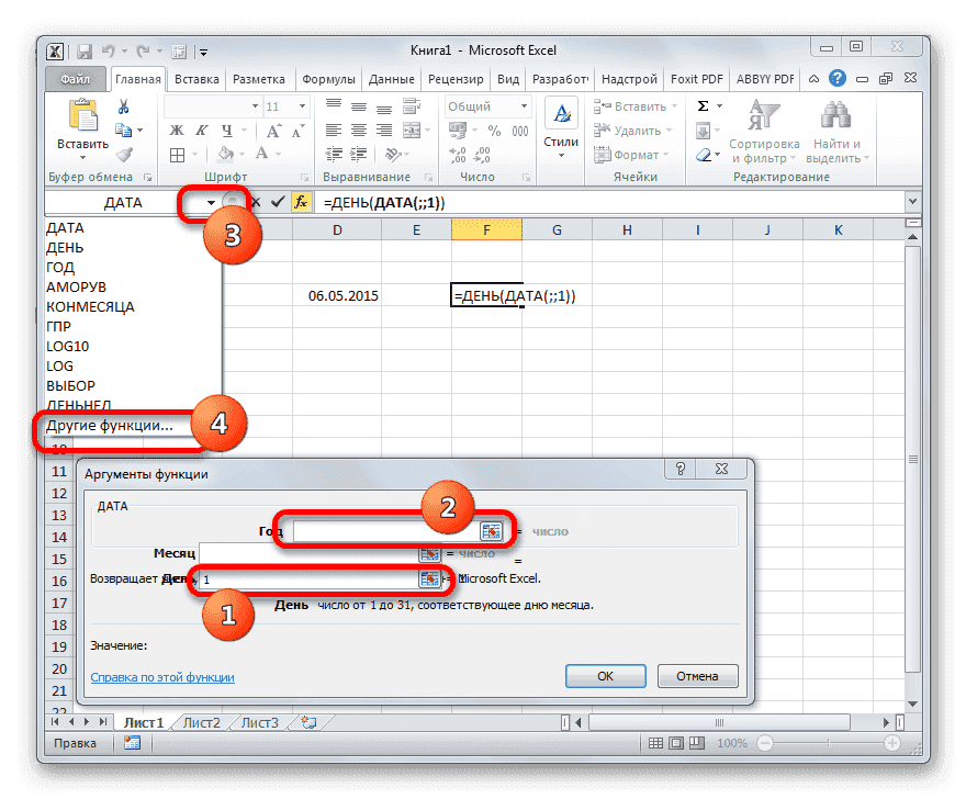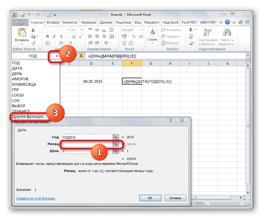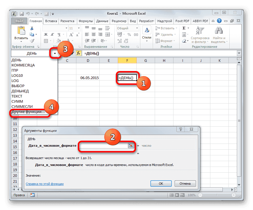 - Выделите ячейку, чтобы просмотреть результат, и перейдите в окно аргументов оператора ДЕНЬ, как мы привыкли. Поместите курсор в единственное поле этого окна и щелкните перевернутый треугольник слева от строки формул. Перейдите в раздел «Другие функции…».