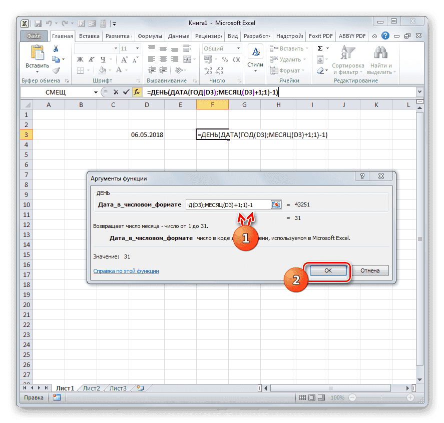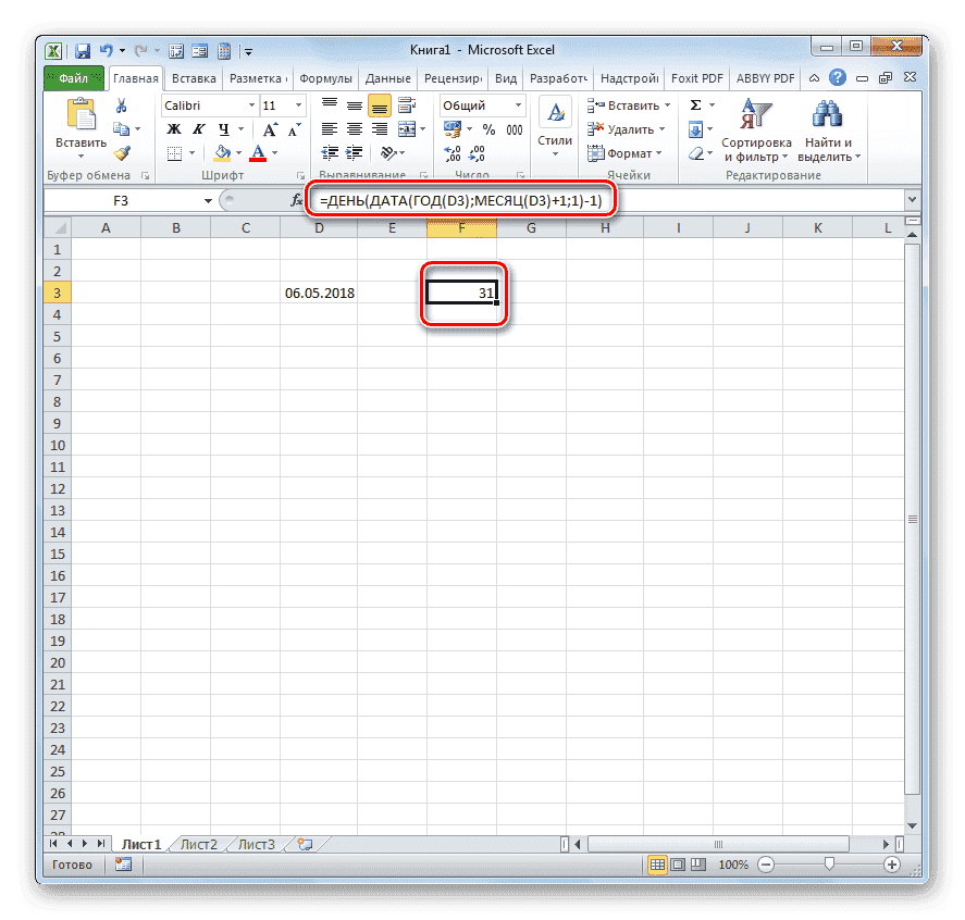 = ДЕНЬ (ДАТА (ГОД (D3); МЕСЯЦ (D3) +1; 1) -1)