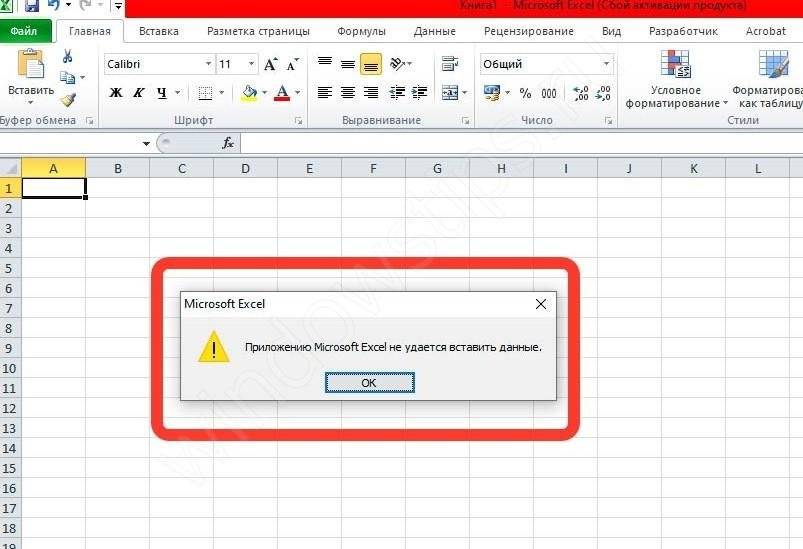 Приложению Excel не удается вставить данные