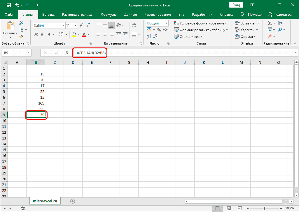 Как известно, среднее значение равно сумме чисел, разделенных на их количество. Эту формулу также можно использовать в Excel.