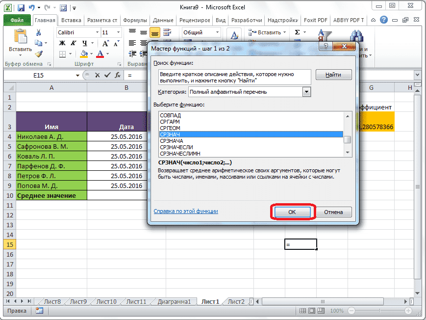 Результат вычисления среднего арифметического будет выделен в выбранной ячейке перед запуском мастера.