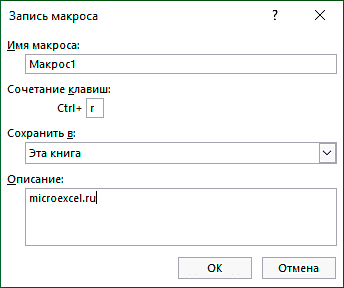 Имя макроса: вы можете изменить или оставить значение по умолчанию («Макрос» со следующим номером). Если у вас уже есть макрос с таким именем, он будет записан в новый программный модуль, который будет создан автоматически.