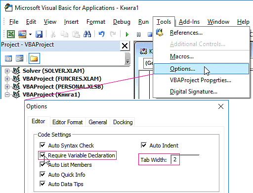 - Перед тем, как вы начнете работать в редакторе, вам следует произвести несложную настройку. Выберите инструмент в редакторе Visual Basic: Инструменты - Параметры. А во вкладке «Редактор» активируйте опцию «Запросить объявление переменной». Это позволит автоматически заполнять операторы Options Explicit в начале каждого вновь сгенерированного кода. А в поле ввода «Ширина карты:» укажите значение 2 вместо 4. Это уменьшит ширину кода. Этот параметр редактора применяется ко всем листам, но в пределах книги.