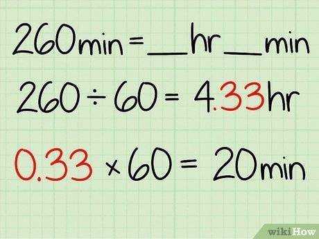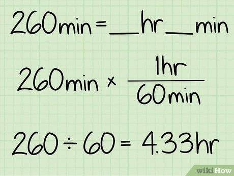- Например, преобразуйте 260 минут в часы и минуты. Сначала преобразуйте минуты в часы: 260 минут x 1 час / 60 минут = 4,33 часа или 4 1/3 часа.