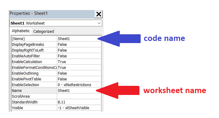 Лучший способ получить доступ к рабочему листу - использовать кодовое имя. У каждого листа есть имя листа и кодовое имя. Имя листа - это имя, которое отображается на вкладке листа в Excel.