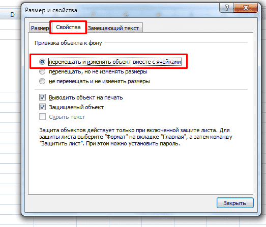 В появившемся диалоговом окне перейдите по ссылке «Свойства» и поставьте перед ней галочку, чтобы переместить и отредактировать объект вместе с ячейками.