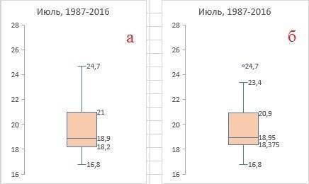 На основе данных о средних температурах июля за последние 30 лет (рис. 2) построим диаграмму «ящик-ус).