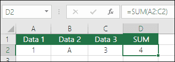 Обратите внимание, что наличие текста, а не числа в ячейке B1 не повлияло на расчеты. Добавляются только числовые значения, а символьные значения игнорируются.