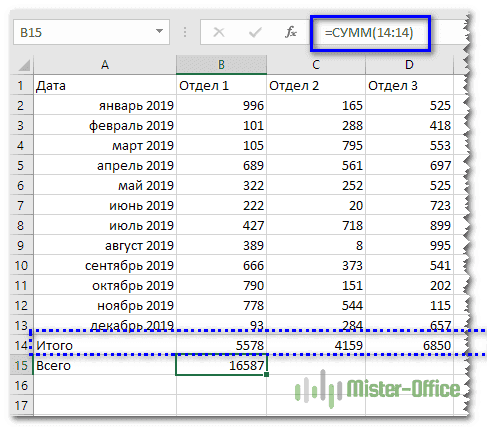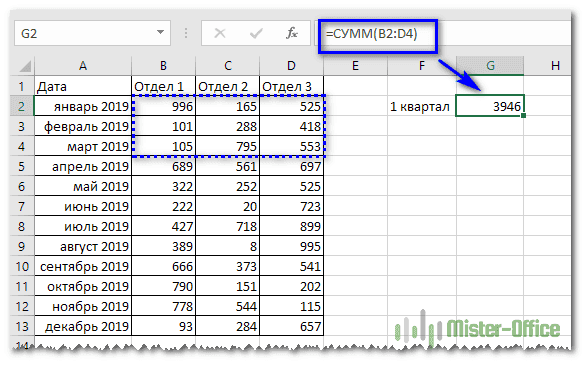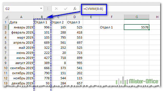 Первый самый простой, «в лоб». Складываем все номера нужного отдела обычной математической операцией сложения. Вроде просто, но представьте, если у вас есть статистика, скажем, за 3 года. Вам нужно обработать 36 номеров…