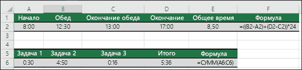 Если вам нужно только сложить часы и минуты, вы можете просто рассчитать сумму, не умножая ее на 24. Во втором примере используется формула =СУММ(A6:C6), потому что здесь вам нужно только рассчитать общее количество часов и минут, потраченных на задачи (5:36, т.е. 5 часов 36 минут).