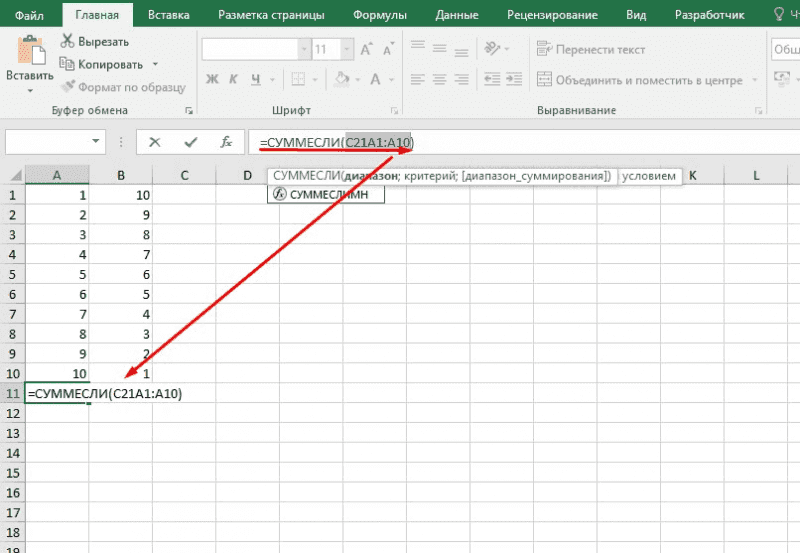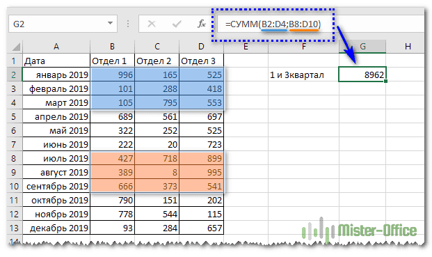 =СУММ(A2:A10,C2:C10) Складывает значения в ячейках A2:10 плюс ячейки C2:C10.