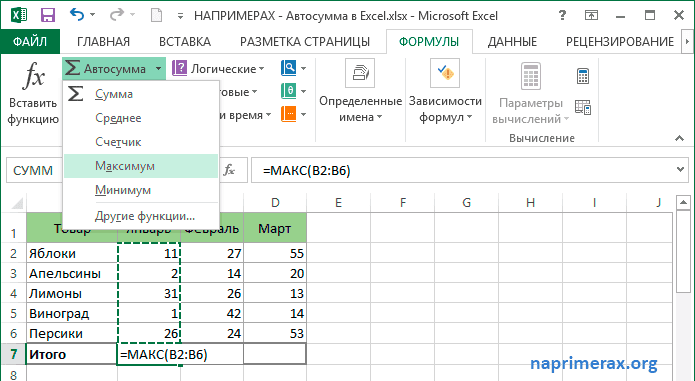 Автосумма в Excel – Использование кнопки Автосумма для вставки других формул (в данном случае Максимум)