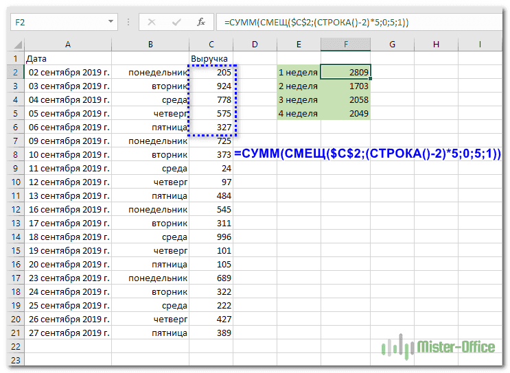Мы используем тот факт, что SUM() может складывать значения не только в диапазоне данных, но и в массиве. Такой массив значений может предоставить функция OFFSET.
