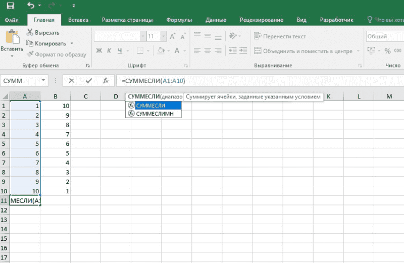 =СУММ(A2:A10) Суммирует значения в ячейках A2:10.