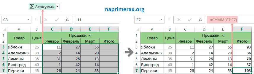 Автосумма в Excel – Сумма выбранных ячеек горизонтально по строкам