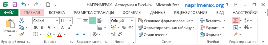 - Вкладка «Главная» -> «Редактировать группу» -> «Автосумма»: