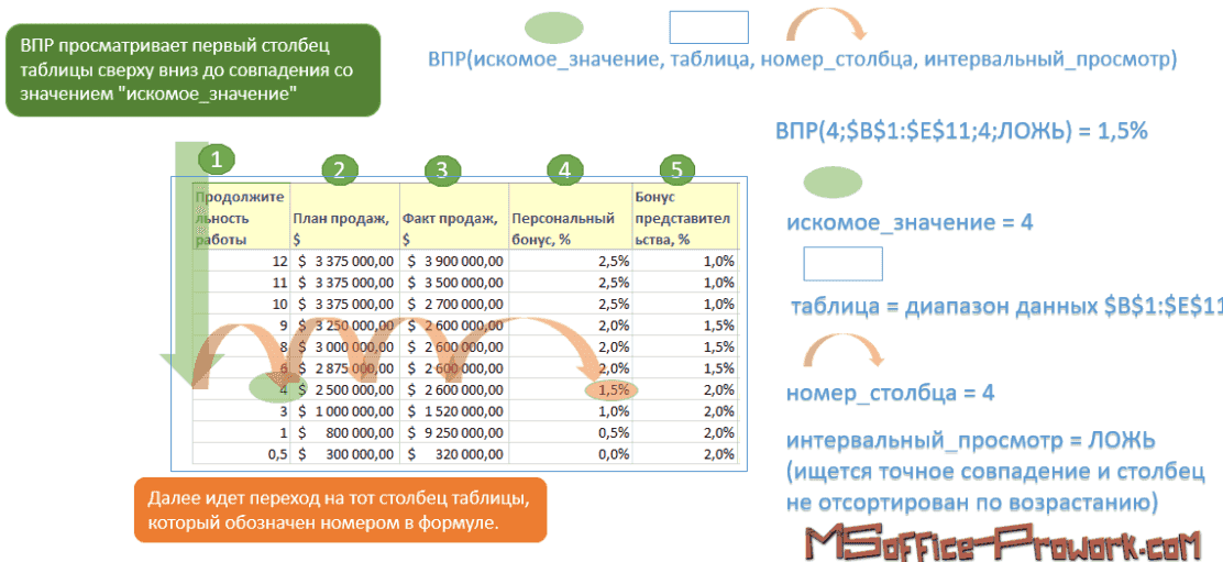 Функция ВПР ищет значение в крайнем левом столбце таблицы и возвращает значение ячейки в указанном столбце той же строки.