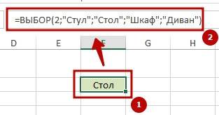 =ВЫБОР(2;»Стул»;»Стол»;»Шкаф»;»Диван”)