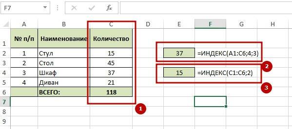 Как видно из примера, результирующее значение 37 в указанном диапазоне находится на пересечении строки №4 и столбца №3 в диапазоне A1:C6, указанном в формуле. На более простом примере показано, как в диапазоне C1:C6 значение 15 стоит на 2-м месте: