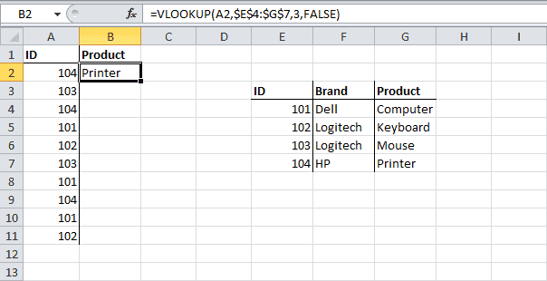 - Функция ВПР ищет идентификатор значения (104) в крайнем левом столбце диапазона $E$4:$G$7 и возвращает значение в третьем столбце той же строки (поскольку третий аргумент функции равен 3).