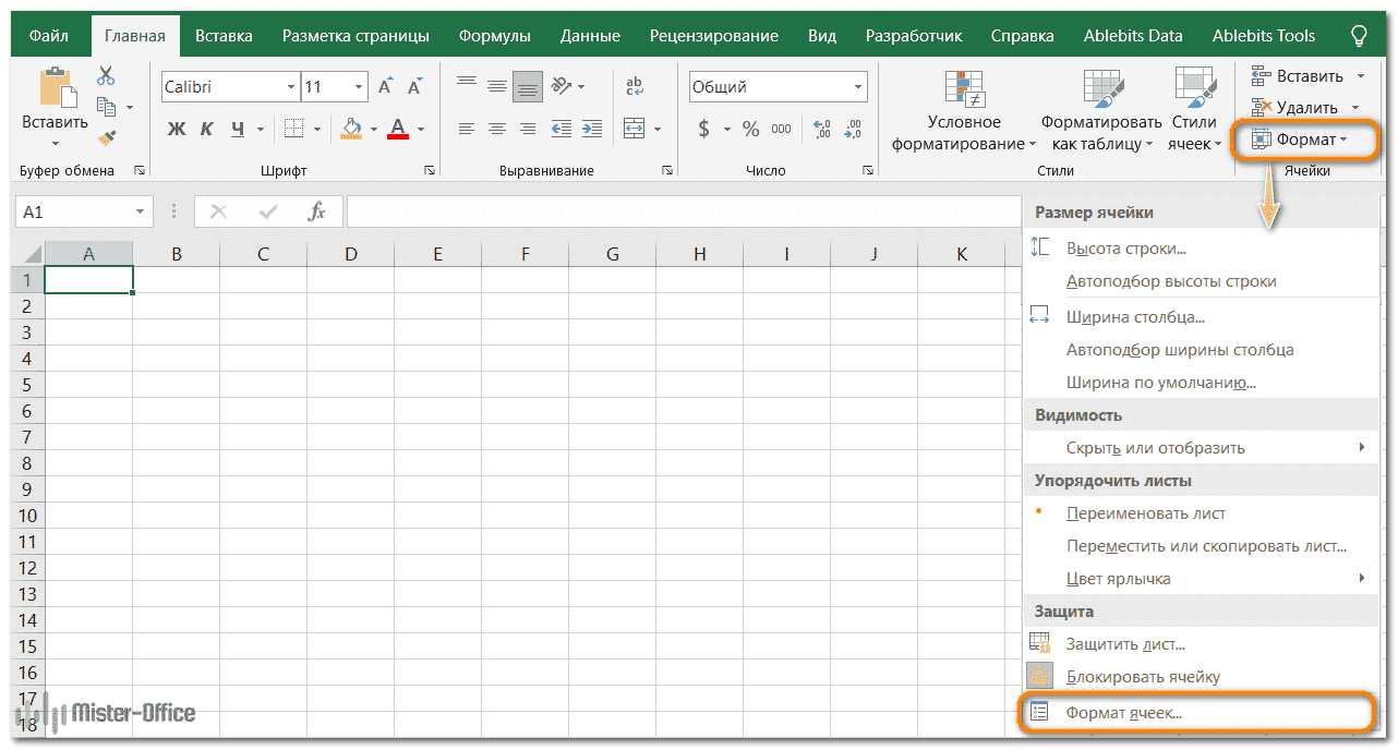 4. На вкладке «Главная» в группе «Ячейки» нажмите кнопку «Форматировать», затем выберите «Форматировать ячейки».