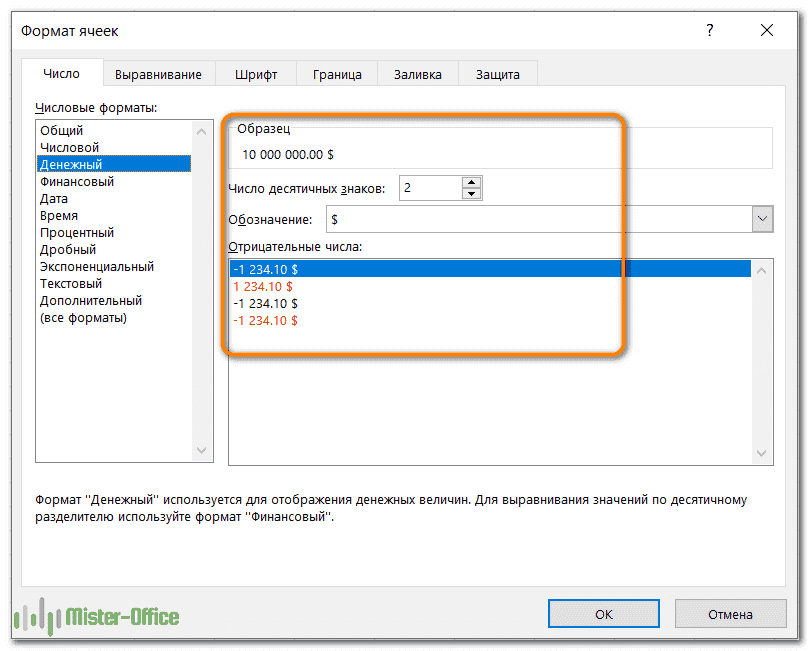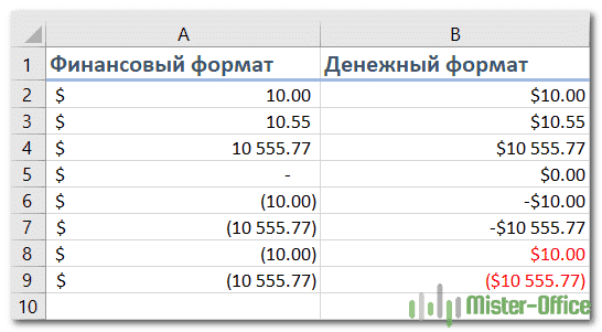 Финансовый формат позволяет настраивать только первые 2 параметра, перечисленных выше.