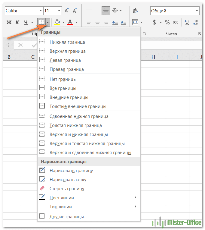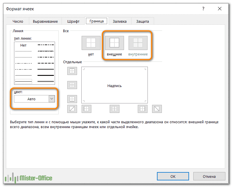 Вкладка «Граница» - создание границ ячеек разных стилей.