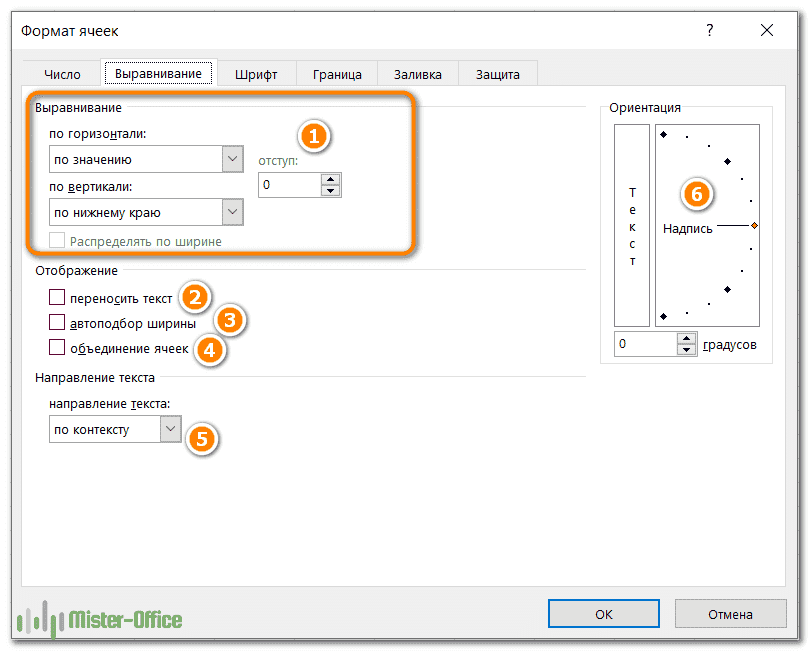 Вкладка «Выравнивание» - изменение выравнивания, положения и направления