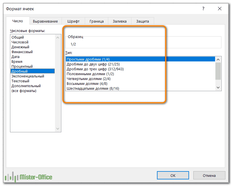 Примечание. При вводе дроби в ячейку, которая ранее не была отформатирована как дробь, может потребоваться ввести ноль и пробел перед дробной частью. Например, если вы вводите 1/8 и установлен формат «Общий», Excel преобразует его в дату (1 августа). Чтобы ввести точно дробь, введите 0 1/8.