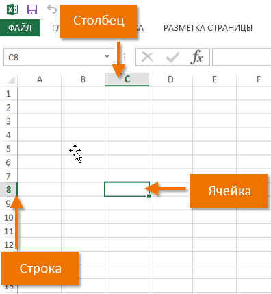 Каждая электронная таблица Excel состоит из тысяч прямоугольников, называемых ячейками. Ячейка — это пересечение строки и столбца. Столбцы в Excel обозначаются буквами (A, B, C), а строки — цифрами (1, 2, 3).