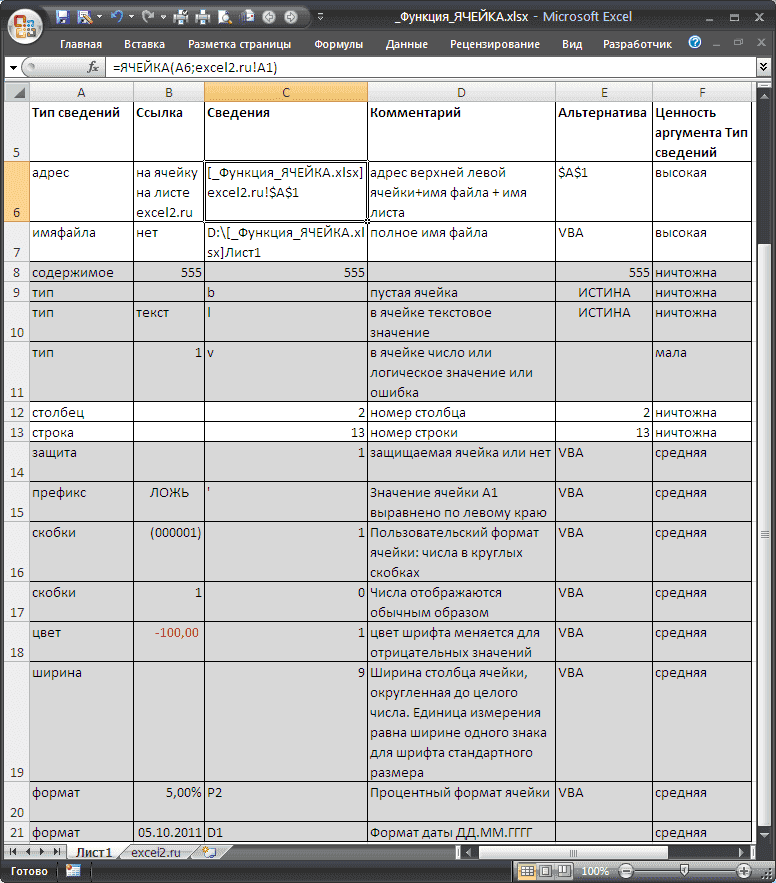 Функция ЯЧЕЙКА() в EXCEL