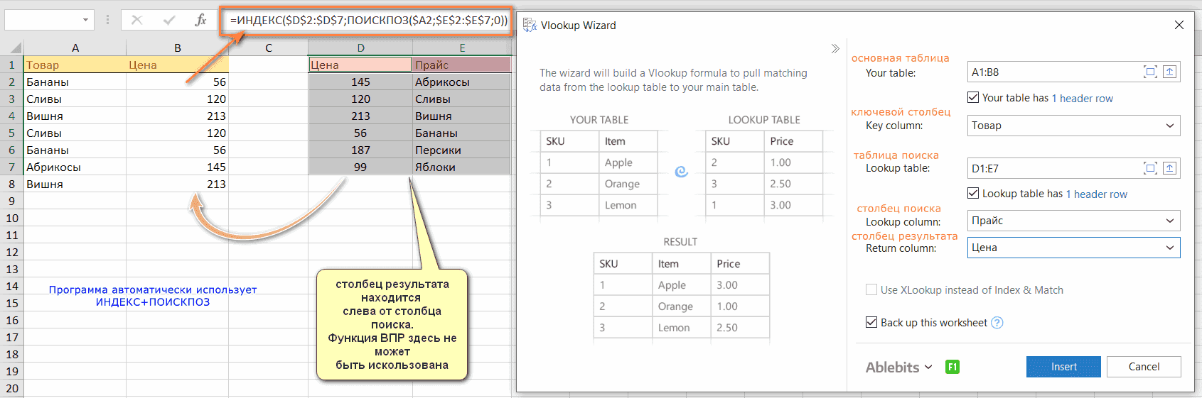 Когда столбец результатов (Цена) находится слева от области поиска (Цена), мастер автоматически вставляет формулу ИНДЕКС+ПОИСКПОЗ: