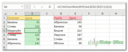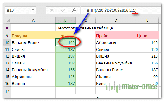Поиск цен на египетские бананы оказался на первой позиции, а на второй зафиксированы сливы. И это слово по правилам алфавита ниже, чем «бананы Египта». Поэтому нет необходимости искать дальше. У нас 145. И неважно, что это цена абрикосов. Поиск цены на сливы продолжался до тех пор, пока D15 не наткнулся на слово, расположенное ниже по алфавиту: яблоки. Останавливаемся и берем цену предыдущей линии.
