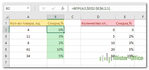 Допустим, у нас есть скидка для покупателей в зависимости от количества купленного товара. Вам нужно быстро рассчитать, сколько процентов причитается за совершенную покупку.