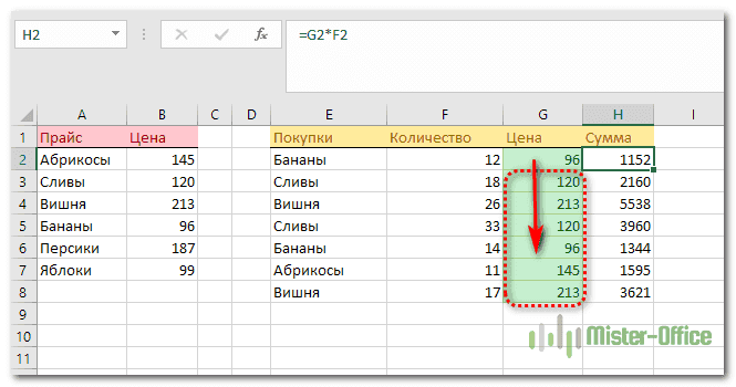 Наш прайс-лист находится в столбцах A и B. Список покупок находится в EH. Допустим, первым пунктом в списке покупок являются бананы. Нам нужно найти этот товар в столбце А, где указаны все наименования, затем поставить его цену в ячейку G2.