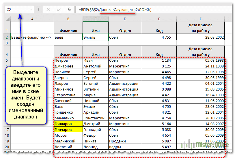 =ВПР($B$2;ДанныеСотрудника;2;ЛОЖЬ)