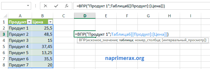 Функция ВПР в Excel – Пример функции ВПР с именем таблицы