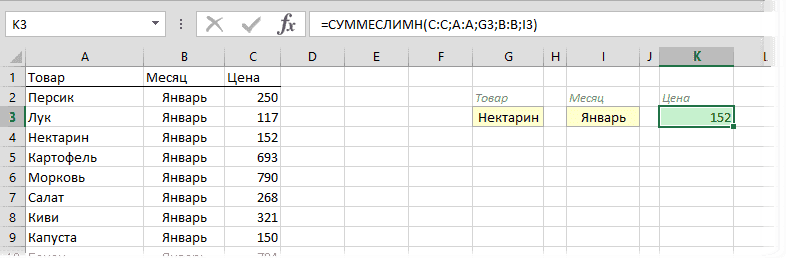 Если вам нужно найти именно число (в нашем случае цена — это просто число), то вместо ВПР можно использовать функцию СУММЕСЛИМН, которая существует с Excel 2007. Теоретически эта функция выбирает и складывает числовые значения значений при различных (до 127!) условиях. Но если в нашем списке нет повторяющихся товаров в течение месяца, он просто отобразит значение цены для данного товара и месяца: