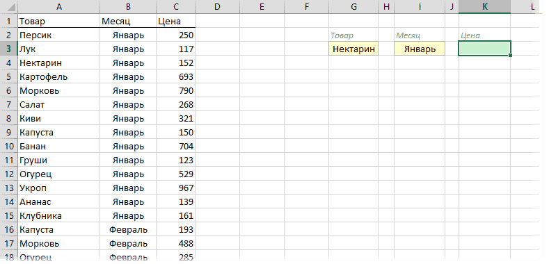 Необходимо найти и извлечь цену на определенный товар (Нектарин) в определенный месяц (январь), то есть получить выход152, но автоматически, то есть по формуле. ВПР в чистом виде здесь не поможет, но есть и другие способы решить эту проблему.