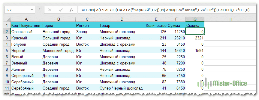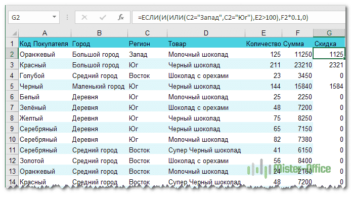 И (ИЛИ (C2 = "Запад", C2 = "Юг")), E2> 100), F2 * 0,1,0)